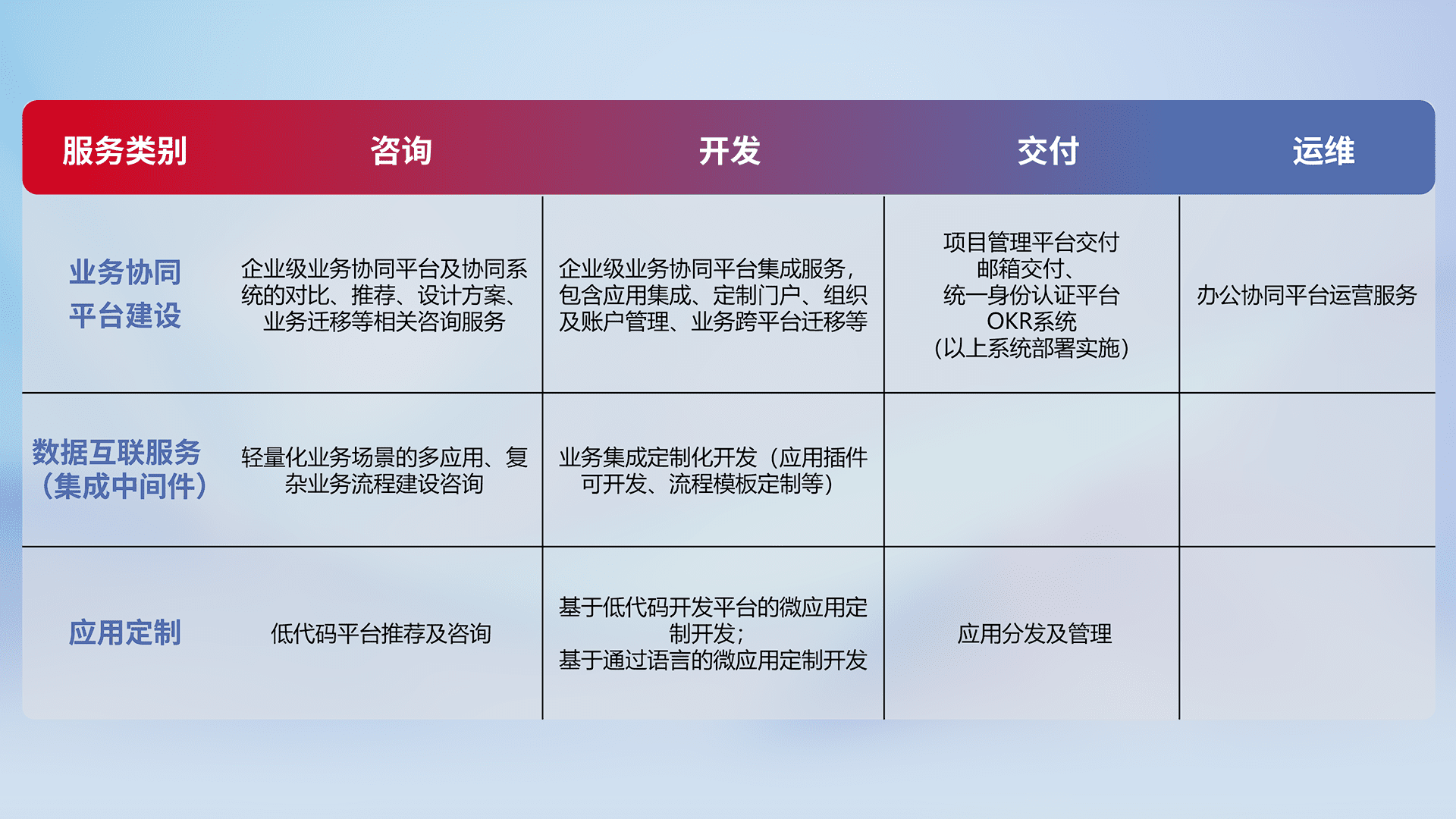 针对钉钉、、、、企微、、、IDaas等平台级产品提供产品的规划、、方案、、交付、、、定制化开发等服务,,实现如统一协同办公、、智能客户服务、、、混合会议管理、、、、智能数据查询、、、等业务场景,,,实现数字化转型。。。