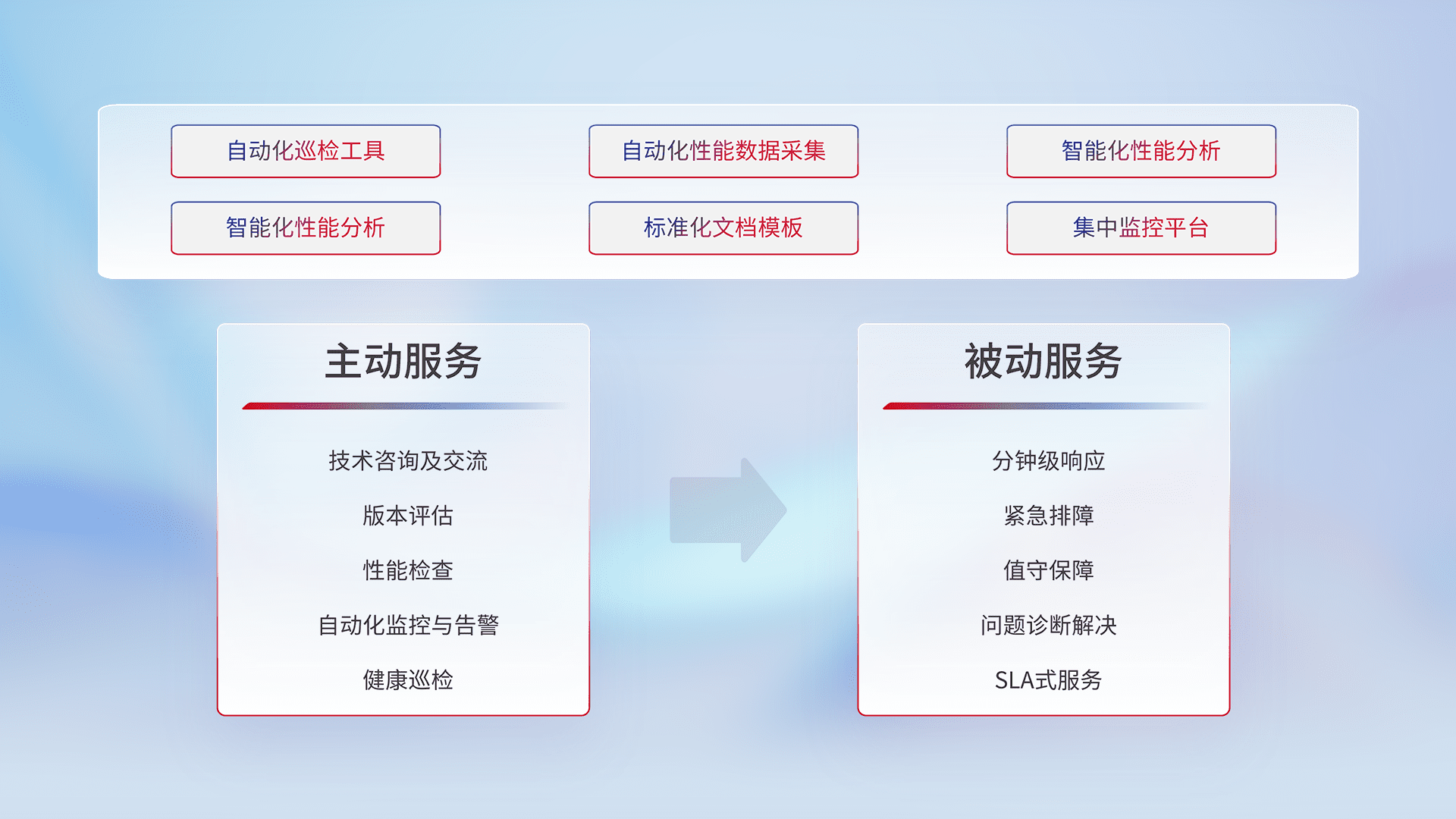 智能化工具和标准化文档,,保障服务质量,,提供主动服务(包含技术咨询、、、、版本评估、、、、性能检查、、自动化监控与告警、、、、健康巡检)和被动服务包含(分钟级响应、、紧急排障、、、、值守保障、、问题诊断解决、、SLA服务)。。。
